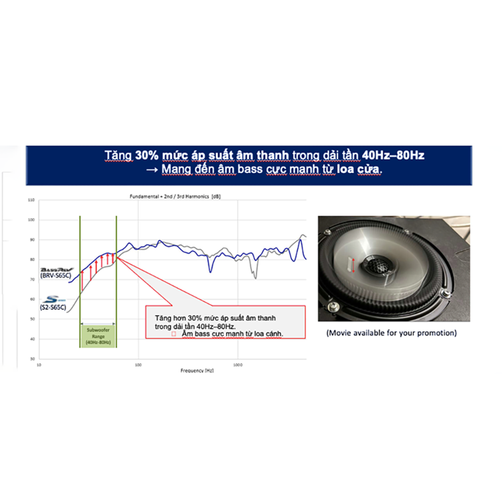 Điểm nhấn ấn tượng nhất của BRV-S65C chính là khả năng tái tạo âm bass. Nhờ thiết kế màng loa có độ rung sâu hơn 28mm, tăng khoảng 30% so với loa thông thường (chỉ 22mm), sản phẩm mang lại: