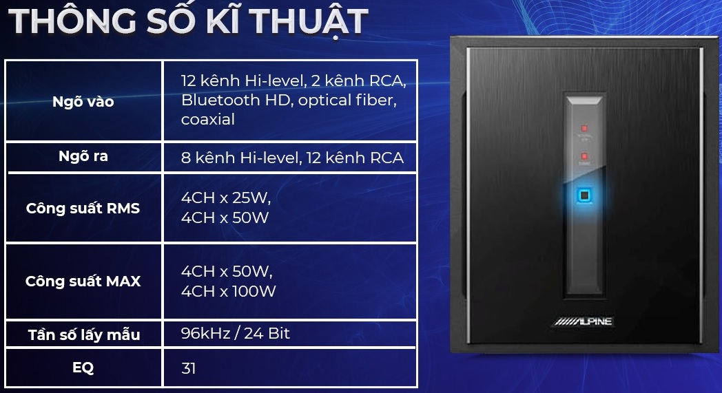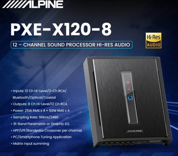 DSP Alpine PXE-X120-8 là bộ DSP tích hợp ampli 8 kênh cao cấp đến từ thương hiệu âm thanh ô tô Nhật Bản Alpine. Thiết bị được thiết kế để nâng cấp âm thanh cho xe từ hệ thống loa zin lên chất lượng nghe nhạc chi tiết, sống động và có chiều sâu hơn. Với kiến trúc xử lý tín hiệu hiện đại, sản phẩm mang lại khả năng căn chỉnh chính xác, giúp tái tạo sân khấu âm thanh rõ nét ngay trong khoang xe.