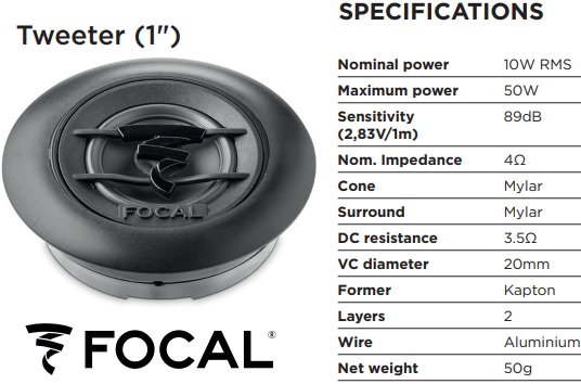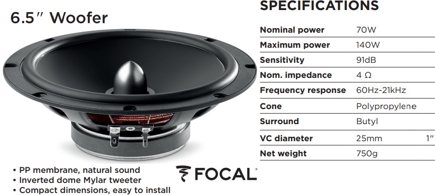 Đây là bộ Focal lắp ô tô với 2 đường tiếng tách rời có kích thước 16.5 cm. Được trang bị một loa trầm (woofer) kích thước 16,5 cm với màng loa làm từ chất liệu Polypropylène và một loa tweeter có thể điều chỉnh hướng với thiết kế vòm ngược (inverted dome).
