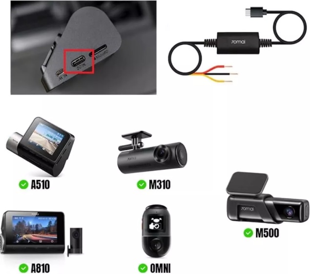 Hardwire Kit 70mai UP03 tương thích với hầu hết các dòng camera hành trình 70mai sử dụng cổng nguồn USB-Type-C như 70mai 4K Omni X800; 70mai A510; 70mai A500S; 70mai A200 và 70mai M310. Các thiết bị này lấy nguồn trực tiếp từ hệ thống điện xe và cấp ổn định 5V–2.4A qua cổng Type-C, nên chỉ phù hợp với camera 70mai có ngõ vào nguồn Type-C, không dùng được cho những camera đời cũ vẫn còn cổng micro-USB.