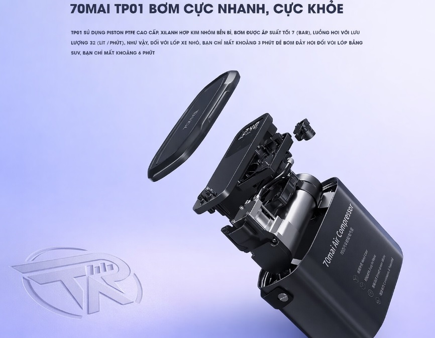 - Với áp suất tối đa ~7 bar (100 PSI), TP01 dễ dàng bơm lốp xe ô tô nhanh và đầy đủ.