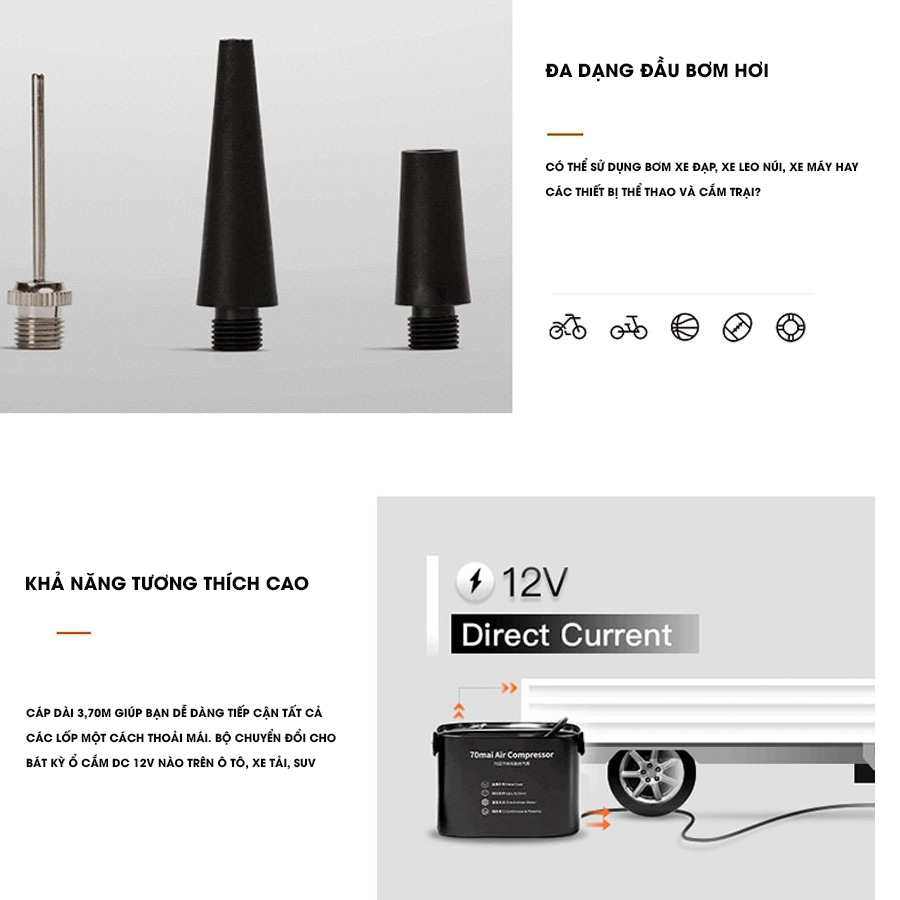 Bộ phụ kiện đi kèm giúp máy kết nối dễ với nhiều loại van lốp – xe máy – xe đạp – bóng bơm…, tăng tính ứng dụng đa năng.