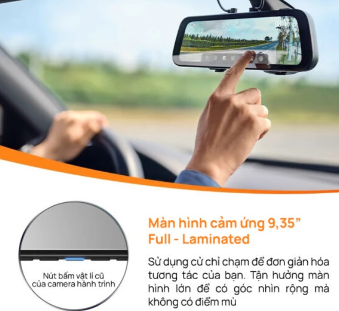 Khác với camera hành trình ghi hình ô tô thông thường, tận dụng màn hình gương làm màn hiển thị với kích thước 9.35 inch cho tầm nhỉn rộng hơn, thao tác trực quan và an toàn hơn khi lái. Kích thước lớn giúp quan sát camera trước – sau rõ ràng, hạn chế điểm mù, đặc biệt hữu ích khi lùi xe hoặc di chuyển trong không gian hẹp.