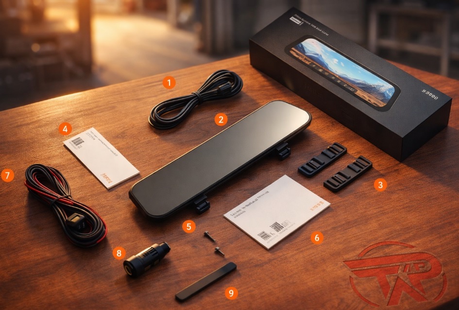 Bao gồm khung/đai gắn gương, ốc vít, dây cáp kết nối camera sau và nguồn.