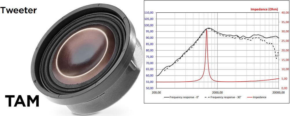 - Công nghệ loa tweeter TAM có khả năng khuếch tán âm thanh góc rộng, vòm ngược chữ M từ nhôm/magie tác động tích cực đến chất lượng âm thanh tạo nên âm treble chi tiết cao.