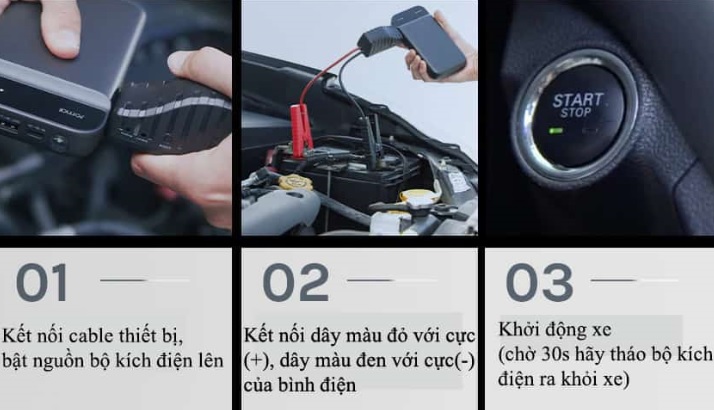 - Bước 3: Bạn vào trong xe và bật khóa điện cũng như khởi động xe. Bạn đợi sau khi xe khởi động được khoảng 30s hãy tháo bộ kích điện ra khỏi xe và cất chúng đi sử dụng cho các lần sau.