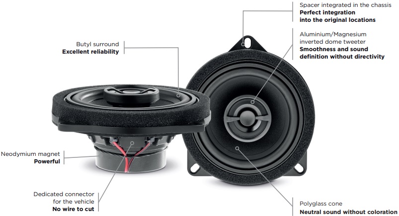 Focal IC BMW 100L là giải pháp nâng cấp âm thanh đúng kỹ thuật và an toàn cho BMW với hệ thống loa đồng trục 2 đường tiếng, kích thước chuẩn 100 mm, lắp Plug & Play không cắt dây giúp giữ nguyên hệ thống điện và nội thất xe.