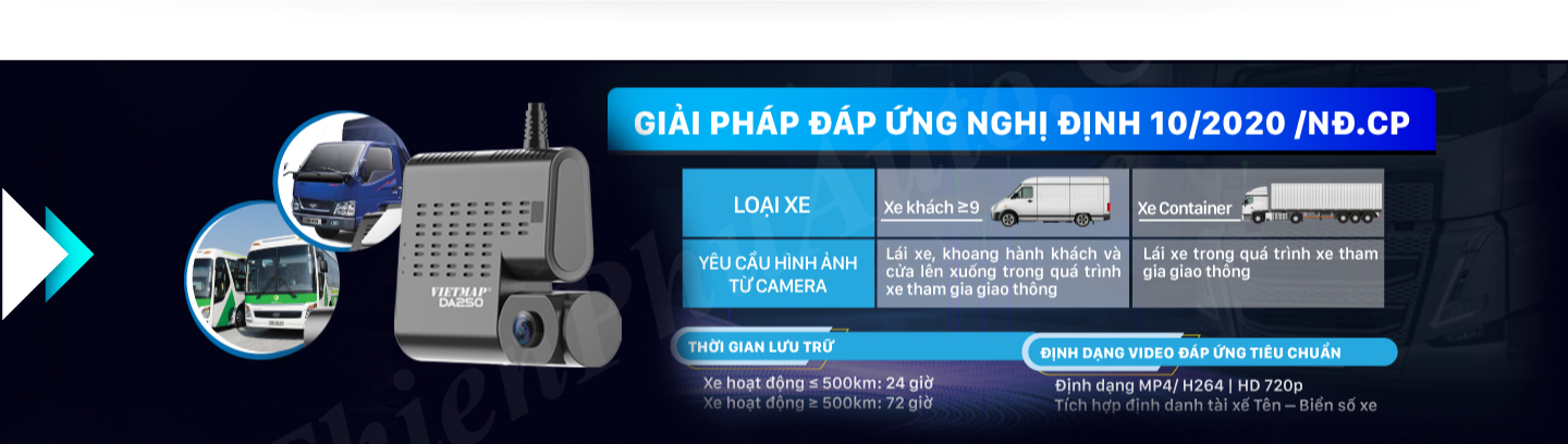 VIETMAP DA250 camera hành trình trực tuyến đáp ứng yêu cầu kỹ thuật, phù hợp tiêu chuẩn nghị định 10/2020/NĐ-CP, tự động lưu trữ hình ảnh truyền dữ liệu về máy chủ tổng cục đường bộ Việt Nam.
