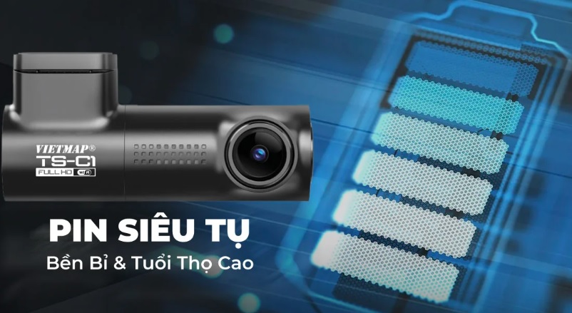 Pin siêu tụ điện của camera hành trình Vietmap phù hợp khi phải đỗ ngoài trời, nắng gắt, xe chạy dịch vụ hoạt động liên tục và bền bỉ hơn. Đây là điểm khiến TS-C1 được gara đánh giá cao so với camera pin thường cùng tầm giá.